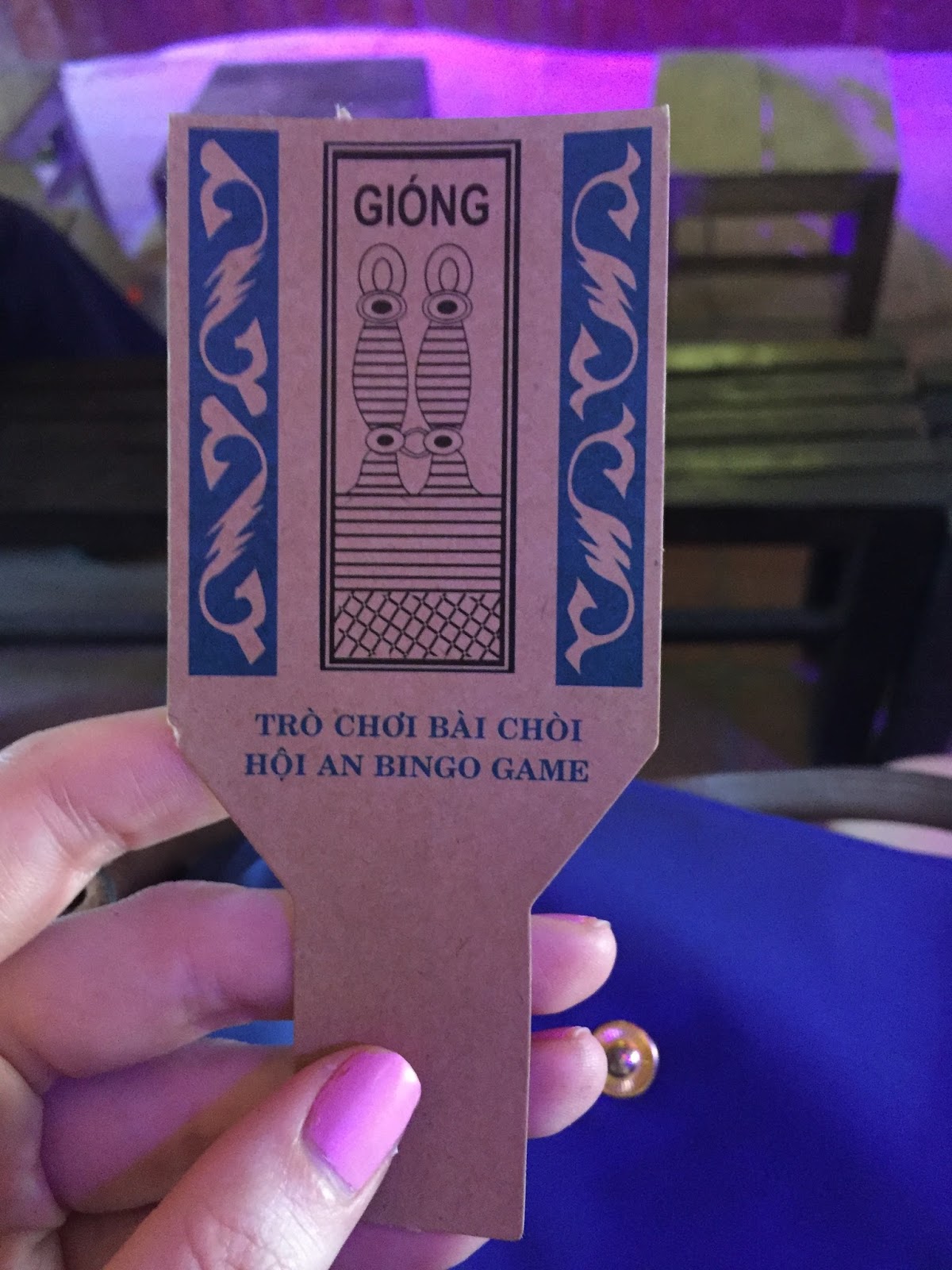 There were chairs everywhere, but also these little huts with platforms where people could climb up and sit. First we sat in a plastic chair, but then we moved up to a hut so that I could have both experiences. You pay to play, and for only a few dollars, you could buy a paddle (like a BINGO card). Occasionally the musicians would draw a stick from a bucket. If your paddle had the icon/word on it, then a little man dressed in yellow brought you a flag. Once you collect three flags, you win! Bingo! Er... Bai Choi? I was so close to winning once, and the second time I completely tanked and got no flags. Either way, I didn't really care. I was entrances by the music, and the little man in the yellow outfit was hilarious and adorable all at the same time. It was such a cool way to spend my first hot evening in Hoi An.